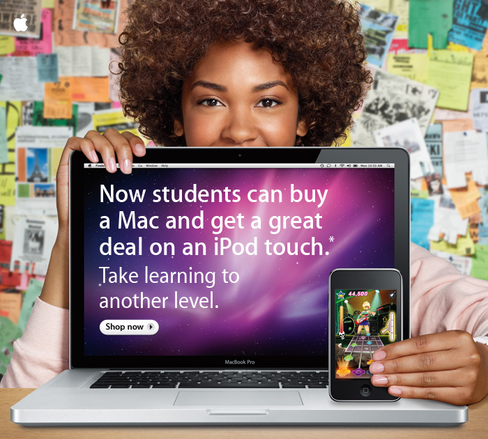 Whether it's for a college or university student, the Mac is the ultimate computer for education. And now it includes something extra special. When students buy a qualifying Mac, they'll get a rebate of up to €160 on an iPod.* And they'll save even more with Apple education pricing. This offer is for a limited time and is available only at the Apple Online Store. Learn more | | * Buy a qualifying Mac and a qualifying iPod with your education discount between 26/05/10 and 07/09/10, and be eligible for a rebate of up to €160. Terms and Conditions apply. Visit www.apple.com/ie/backtoschool for full details. Not all Apple products qualify for education pricing. Apple, the Apple logo, Mac and iPod are trademarks of Apple Inc, registered in the U.S. and other countries. | | Some products and promotions are not available in all countries. Prices and product specifications are subject to change. | | Some applications are not available in all areas. Application availability and pricing are subject to change. | | Content sold separately. Available on iTunes. Title availability is subject to change. | | Mention of third-party products is for informational purposes only and represents neither an endorsement nor a warranty. Apple assumes no responsibility with regard to the selection, performance, or use of these vendors or products. | Prices include taxes but may not include shipping. For more detailed information on the Apple Online Store terms and conditions, please click here. Free shipping is available on all iPod models and on orders over €121 inc VAT. | | Apple Sales International, Hollyhill Industrial Estate, Cork, Ireland. Company Registration number: 15719. VAT number: IE6554690W. If you would prefer not to receive commercial email from Apple, or if you have changed your email address, please click here. TM and copyright © 2010 Apple Inc. | | |